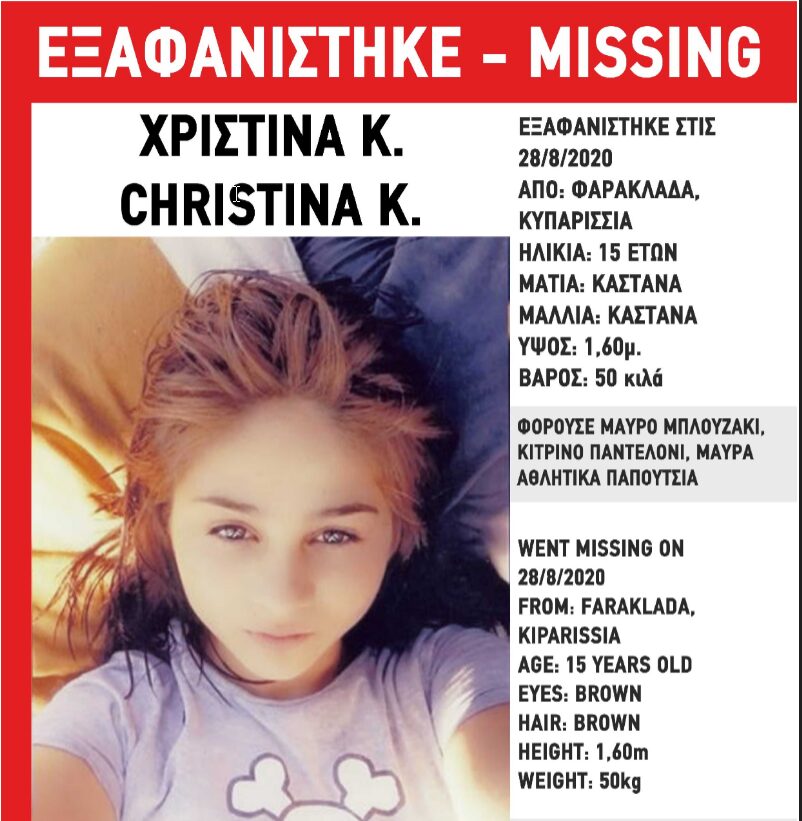 Στις 28/08/2020, μεσημεριανές ώρες, εξαφανίστηκε από την περιοχή Φαρακλάδα της Κυπαρισσίας, η Χριστίνα Κ., 15 ετών.