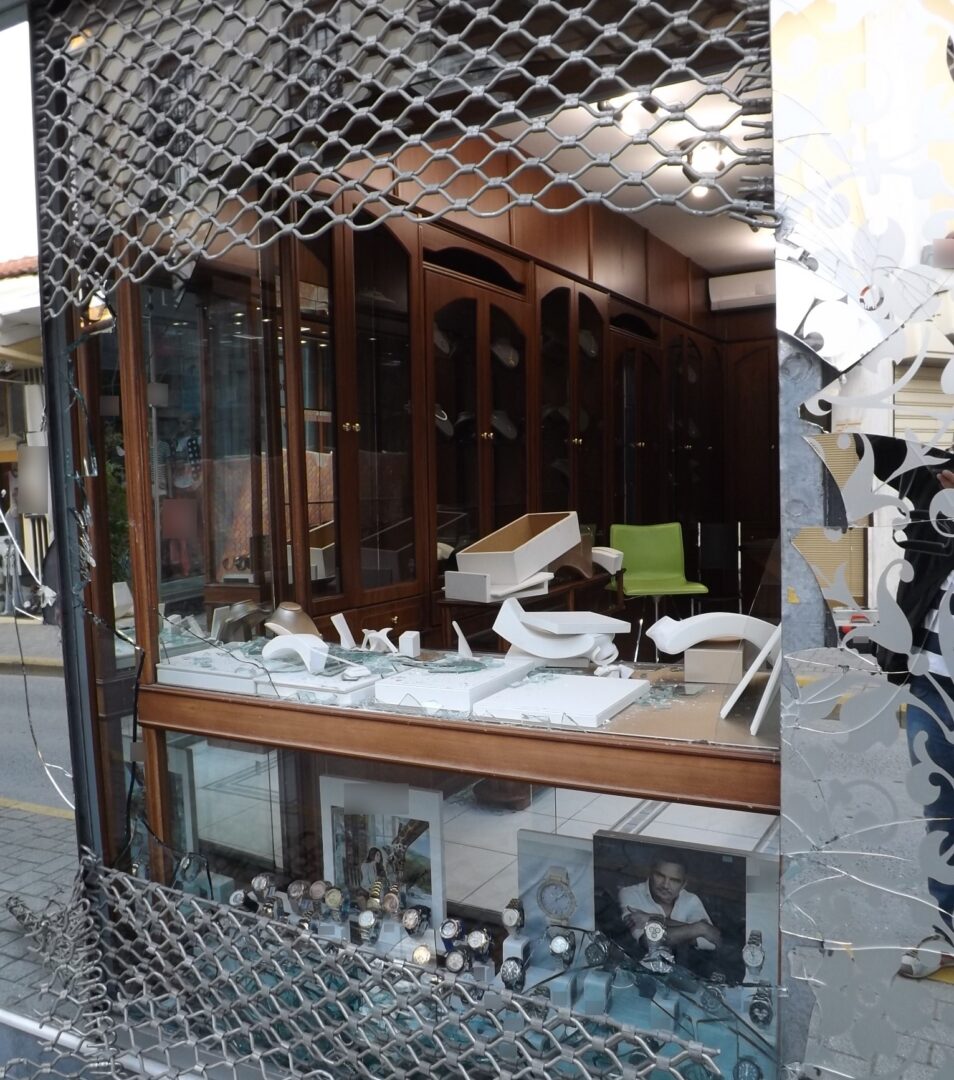 Στη συνέχεια έκοψαν τον μεταλλικό ρολό ασφαλείας και έσπασαν τον υαλοπίνακα του κοσμηματοπωλείου, αφαιρώντας από το εσωτερικό του καταστήματος διάφορα κοσμήματα και χρυσαφικά, η αξία των οποίων υπερβαίνει τις 80.000 ευρώ, σύμφωνα με εκτίμηση του ιδιοκτήτη.