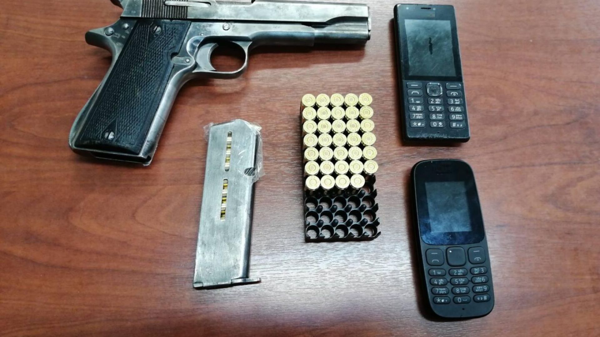 Σε έρευνα που πραγματοποιήθηκε στην οικία του 35χρονου, βρέθηκαν και κατασχέθηκαν ένα πιστόλι με 42 φυσίγγια και δύο κινητά τηλέφωνα.
