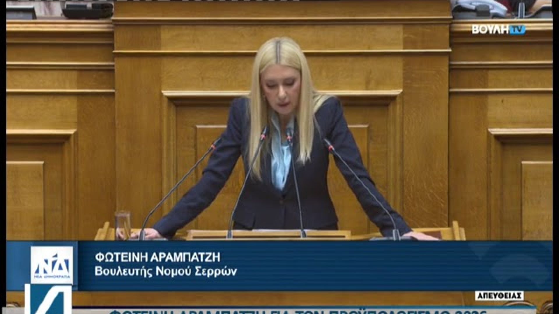 Για έναν Προϋπολογισμό, που βάζει τη χώρα σε σταθερή και κοινωνικά δίκαιη τροχιά ανάπτυξης έκανε λόγο η Ειδική Εισηγήτρια της ΝΔ, Βουλευτής Σερρών της ΝΔ κα Φωτεινή Αραμπατζή στην ομιλία της στη Βουλή κατά τη συζήτηση για τον Κρατικό Προϋπολογισμό του 2026. Η κυρία Αραμπατζή τόνισε ότι ο κρατικός προϋπολογισμός του 2026 συνδυάζει σταθερότητα, κοινωνική προστασία και αναπτυξιακή προοπτική, αναδεικνύοντας τον στρατηγικό χαρακτήρα του νέου δημοσιονομικού σχεδίου της χώρας.