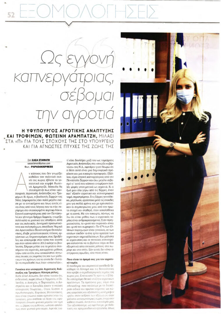 Η Υφυπουργός Αγροτικής Ανάπτυξης και Τροφίμων Φωτεινή Αραμπατζή μιλάει στα «Π» για τους στόχους της στο Υπουργείο και για άγνωστες πτυχές της ζωής της