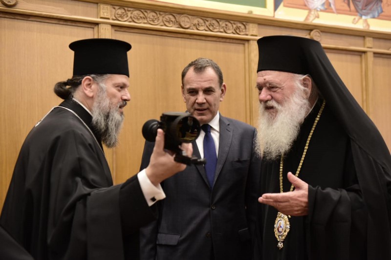 Ο υπουργός Αμυνας επισκέφθηκε σήμερα την Ιερά Σύνοδο όπου παρέλαβε τέσσερις θερμικές διόπτρες σύγχρονης τεχνολογίας αξίας 49.000 ευρώ οι οποίες θα χρησιμοποιηθούν για την θωράκιση των ελληνοτουρκικών συνόρων στον Έβρο.
