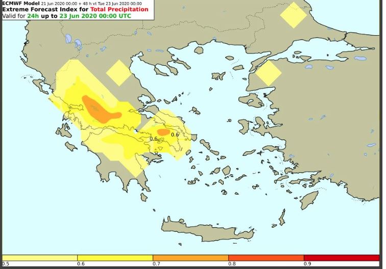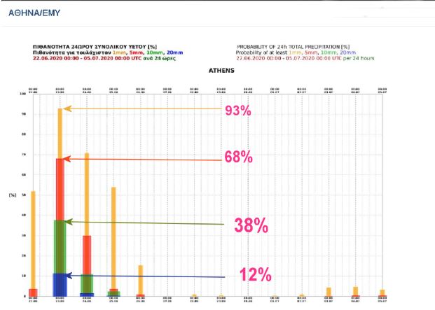 «Για την Δευτέρα βλέπουμε ότι έχουμε πιθανότητες 93% για βροχή τουλάχιστον ύψους ενός χιλιοστού (1 mm με πορτοκαλί χρωματισμό στο διάγραμμα). Υπάρχει επίσης 68% πιθανότητα για βροχή έως 5 mm (με κόκκινη στήλη), συνέχεια με 38% για ύψος βροχής έως 10 mm (πράσινη στήλη) και τέλος πιθανότητα 12% για βροχή τουλάχιστον 20 mm (με μπλε χρώμα). Άρα βγάζουμε το συμπέρασμα ότι θα βρέξει και υπάρχει υπολογίσιμη πιθανότητα να έχουμε μεγάλα ύψη βροχής πάνω από π.χ. 10 mm για το σημείο του μετεωγράμματος που εξετάζουμε. Την τοπικότητα θα την εξετάσουν περαιτέρω οι μετεωρολόγοι μελετώντας άλλες παραμέτρους», ανέφερε χαρακτηριστικά ο κ. Κολυδάς.