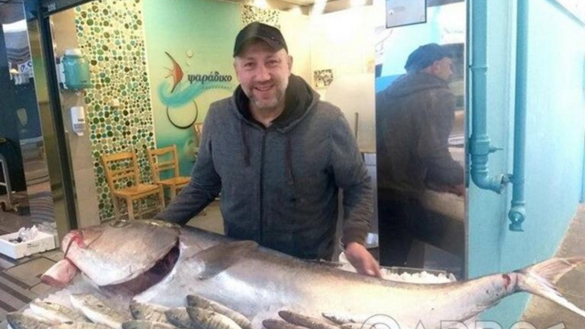 Ο ιδιοκτήτης του ιχθυοπωλείου στην Καλαμάτα ποζάρει χαμογελαστός. Μπροστά του βρίσκεται ένα ψάρι που ζυγίζει 53,8 κιλά…