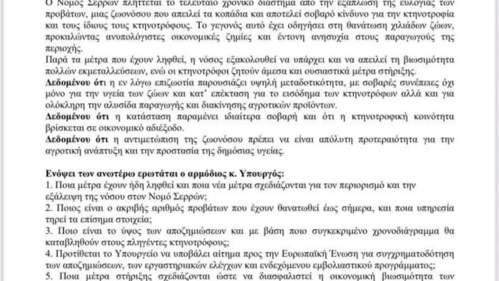 Με ερώτηση που κατέθεσαν προς τον Υπουργό Αγροτικής Ανάπτυξης και Τροφίμων, οι βουλευτές του ΠΑΣΟΚ αναδεικνύουν τη δραματική κατάσταση που βιώνουν οι Σερραίοι κτηνοτρόφοι, μετά τη θανάτωση χιλιάδων ζώων, τις ανυπολόγιστες οικονομικές απώλειες και την έλλειψη επαρκούς κρατικής στήριξης.