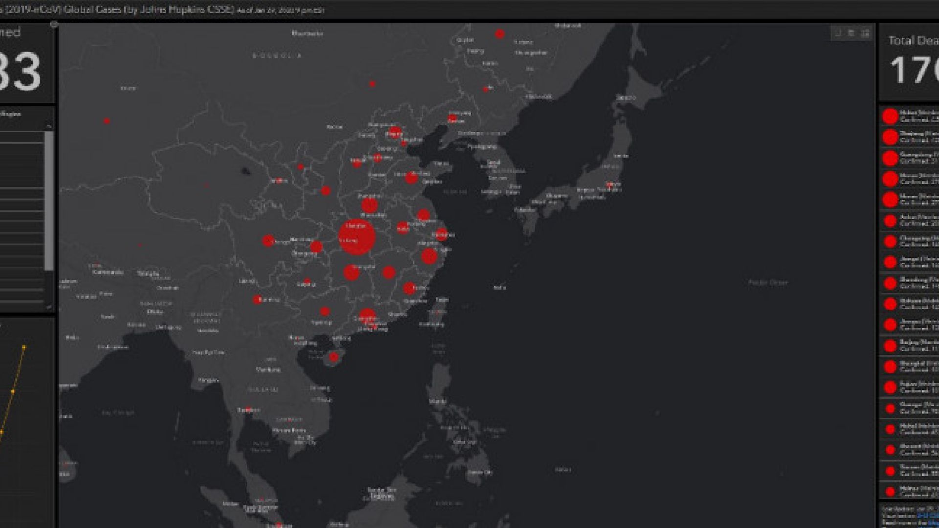 Κάνοντας κάποιος κλικ, μπορεί να εντοπίσει περιοχές όπου οι ασθενείς έχουν διαγνωσθεί με κοροναϊό – όσο περισσότερες περιπτώσεις είναι σε μία περιοχή, τόσο μεγαλύτερη είναι και η κουκκίδα στον χάρτη (αυτή την στιγμή η μεγαλύτερη κουκκίδα είναι στην επαρχία Χουμπέι, όπου ξέσπασε και η επιδημία κοροναϊού). Ο χάρτης παρακολουθεί, επίσης, και τους θανάτους, συνολικά και ανά πόλη.