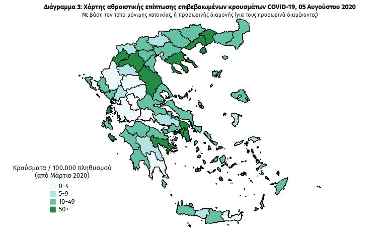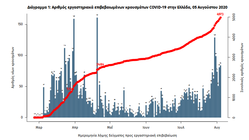 Ο συνολικός αριθμός των κρουσμάτων είναι 4.973, εκ των οποίων το 54,6% αφορά άνδρες. 1.349 (27,1%) θεωρούνται σχετιζόμενα με ταξίδι από το εξωτερικό και 2.479 (49,8%) είναι σχετιζόμενα με ήδη γνωστό κρούσμα.