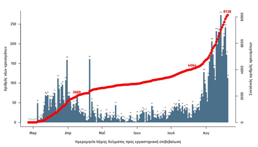 1802 (22.1%) θεωρούνται σχετιζόμενα με ταξίδι από το εξωτερικό και 3752 (46.1%) είναι σχετιζόμενα με ήδη γνωστό κρούσμα.
