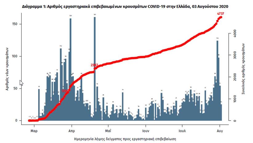 Σήμερα ανακοινώνουμε 77 νέα κρούσματα του νέου ιού στη χώρα, εκ των οποίων τα 8 εντοπίστηκαν κατόπιν ελέγχων στις πύλες εισόδου της χώρας. Ο συνολικός αριθμός των κρουσμάτων είναι 4.737, εκ των οποίων το 54,7% αφορά άνδρες.
