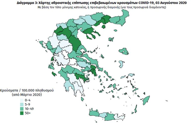1.303 (27,5%) θεωρούνται σχετιζόμενα με ταξίδι από το εξωτερικό και 2.345 (49,5%) είναι σχετιζόμενα με ήδη γνωστό κρούσμα.