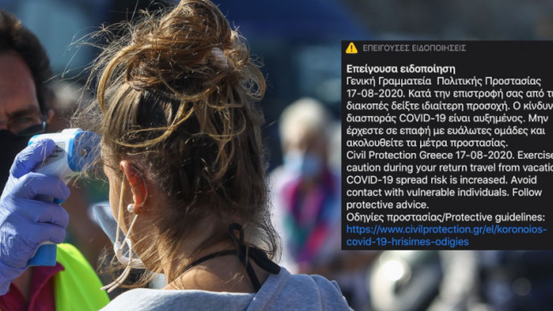 «Γενική Γραμματεία Πολιτικής Προστασίας – 17-08-2020. Κατά την επιστροφή σας από τις διακοπές δείξτε ιδιαίτερη προσοχή. Ο κίνδυνος διασποράς COVID-19 είναι αυξημένος. Μην έρχεστε σε επαφή με ευάλωτες ομάδες και ακολουθείτε τα μέτρα προστασίας».