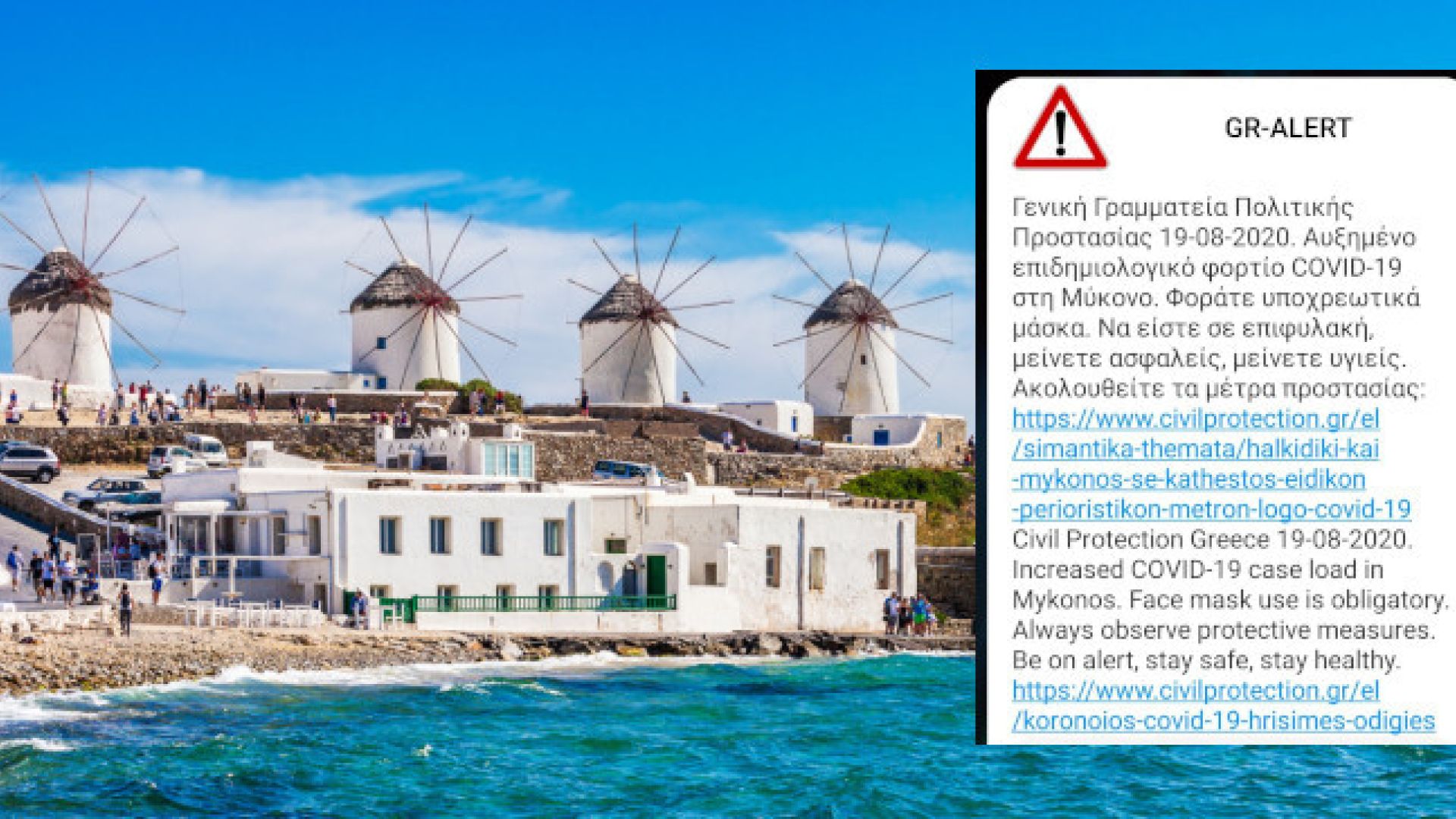 Γενική Γραμματεία Πολιτικής Προστασίας 19-08-2020. Αυξημένο επιδημιολογικό φορτίο COVID-19 στη Μύκονο. Φοράτε υποχρεωτικά μάσκα. Να είστε σε επιφυλακή, μείνετε ασφαλείς, μείνετε υγιείς. Ακολουθείτε τα μέτρα προστασίας.