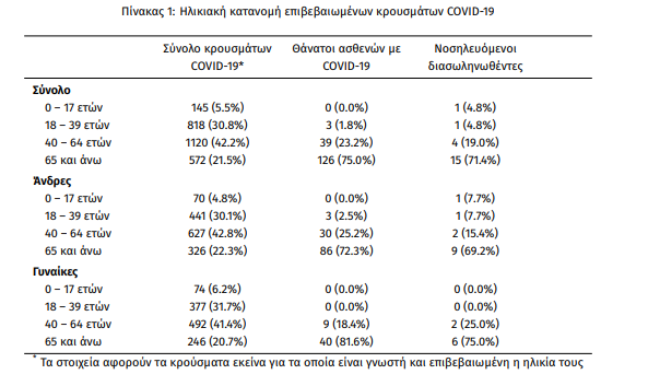 Από την έκθεση του ΕΟΔΥ προκύπτει, δηλαδή, βαριά επίπτωση που έχει ο νέος κορωνοϊός στα άτομα ηλικίας άνω των 65 ετών καθώς τα 3 στα 4 θανατηφόρα κρούσματα αφορούν άτομα της συγκεκριμένης ηλικιακής ομάδας η οποία αποτελεί το 21,5% του συνόλου των κρουσμάτων.