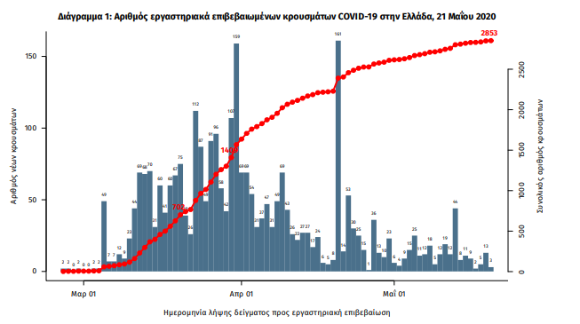 Σύμφωνα με την έκθεση του ΕΟΔΥ, από την 1η Ιανουαρίου 2020 μέχρι σήμερα, στα εργαστήρια που διενεργούν ελέγχους για τον νέο κορωνοϊό (SARS-CoV-2) και που δηλώνουν συστηματικά στον ΕΟΔΥ το σύνολο των δειγμάτων που ελέγχουν (θετικά και αρνητικά), έχουν συνολικά ελεγχθεί144078κλινικά δείγματα, εκ των οποίων τα 4.540(3.2%)ήταν θετικά στον κορωνοϊό (συμπεριλαμβάνονται και περισσότερα από ένα δείγματα ανά άτομο που ελέγχθηκε).