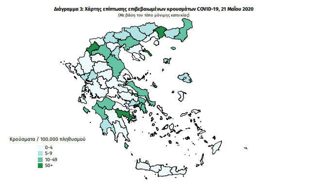 Οσον αφορά τον γεωγραφικό χάρτη των κρουσμάτων, δεν έχει αλλάξει κάτι, με τους Νομούς Φωκίδας, Ευρυτανίας και Γρεβενών να παραμένουν χωρίς επιβεβαιωμένο κρούσμα.