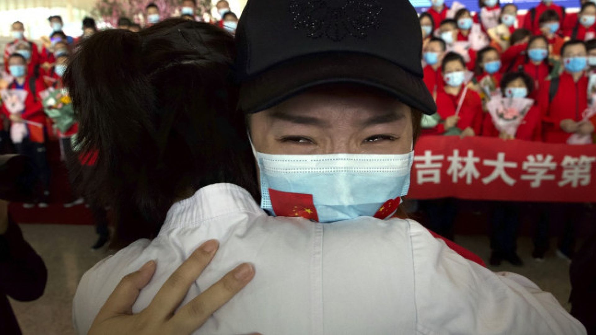Αλλοι πάλι μέσα σε κλίμα έντονης χαράς, αγκάλιαζαν γιατρούς και νοσηλευτές που επέστρεφαν στην πόλη Ουχάν, μετά την άρση των αυστηρών μέτρων.