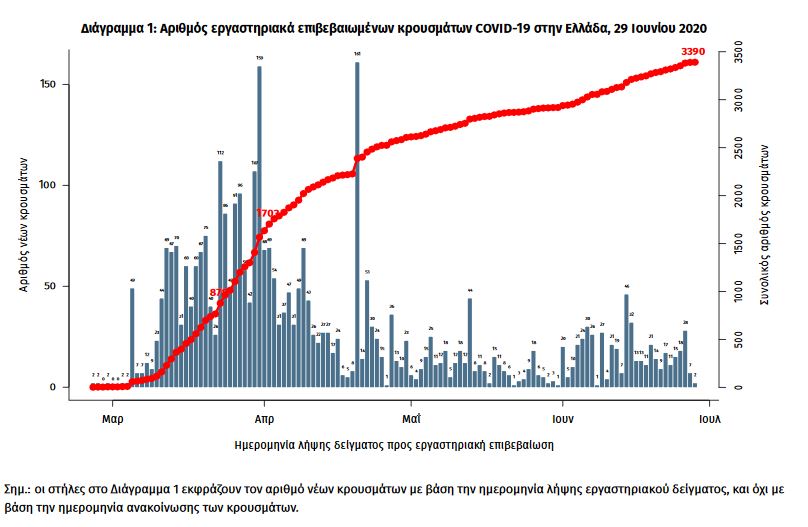 Σήμερα ανακοινώνουμε 15 νέα κρούσματα του νέου ιού στη χώρα. Ο συνολικός αριθμός των κρουσμάτων είναι 3390, εκ των οποίων το 54.9% άνδρες αφορά άνδρες. 757 (22.3%) θεωρούνται σχετιζόμενα με ταξίδι από το εξωτερικό και 1881 (55.5%) είναι σχετιζόμενα με ήδη γνωστό κρούσμα.
