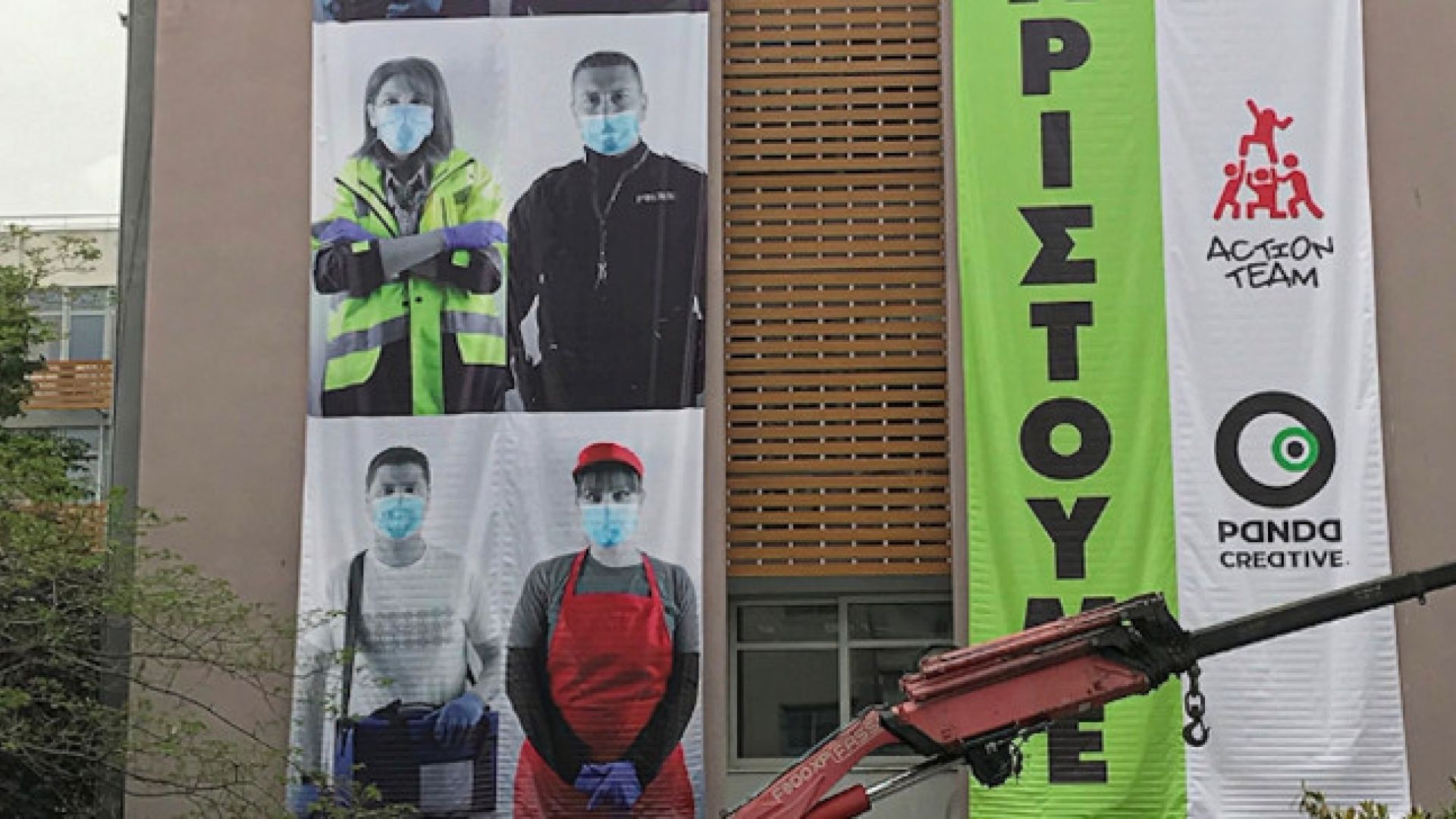 Με τη συνδρομή της εθελοντικής ομάδας νέων της Action Team και του Καβαλιώτη γραφίστα Κυριάκου Αντωνιάδη που εργάστηκε αφιλοκερδώς, το πρωί της Κυριακής, με τη βοήθεια ενός γερανοφόρου οχήματος, η πίσω όψη του διοικητηρίου «ντύθηκε» με ένα υπερμεγέθη πανό που ξεπερνούσε σε ύψος τα 15 μέτρα. Πάνω σ’ αυτό παρουσιάζεται η καμπάνια «Ευχαριστούμε», στην οποία πρωταγωνιστούν έξι Καβαλιώτες που αντιπροσωπεύουν ο καθένας ένα από τα επαγγέλματα που δεν σταμάτησαν να εργάζονται σε όλη τη διάρκεια της εφαρμογής των μέτρων.