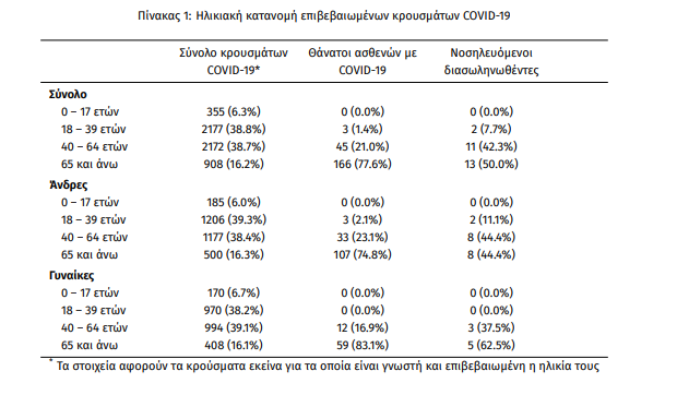 Σύμφωνα με τα έως χθες δεδομένα, στο σύνολο των κρουσμάτων από την αρχή της πανδημίας, η μέση ηλικία των κρουσμάτων είναι 43 έτη (εύρος 0 έως 102 ετών), ενώ η μέση ηλικία των θανάτων είναι 76 έτη (εύρος 35 έως 102 ετών).