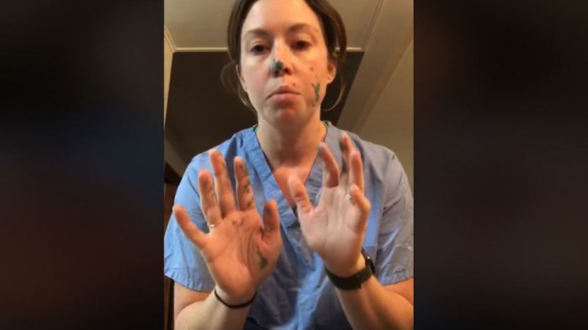 Στο βίντεό της, η νοσοκόμα προσομοιώνει τη μετάβαση στο σούπερ μάρκετ και ξεκινά φορώντας γάντια στα χέρια της, αρπάζοντας το κινητό της καθώς βγαίνει από το αυτοκίνητό της, ενώ στη συνέχεια καθαρίζει ένα καλάθι του σούπερ μάρκετ, και πιάνει μια συσκευασία χαρτιού υγείας. Χρησιμοποιεί ένα κομμάτι χαρτόνι για κινητό τηλέφωνο και βουτάει τα δάχτυλά της σε ένα πιάτο με χρώμα για να αναπαραστήσει τα μικρόβια στα χέρια της, αφότου, και καλά, έχει πιάσει το χαρτί υγείας.
