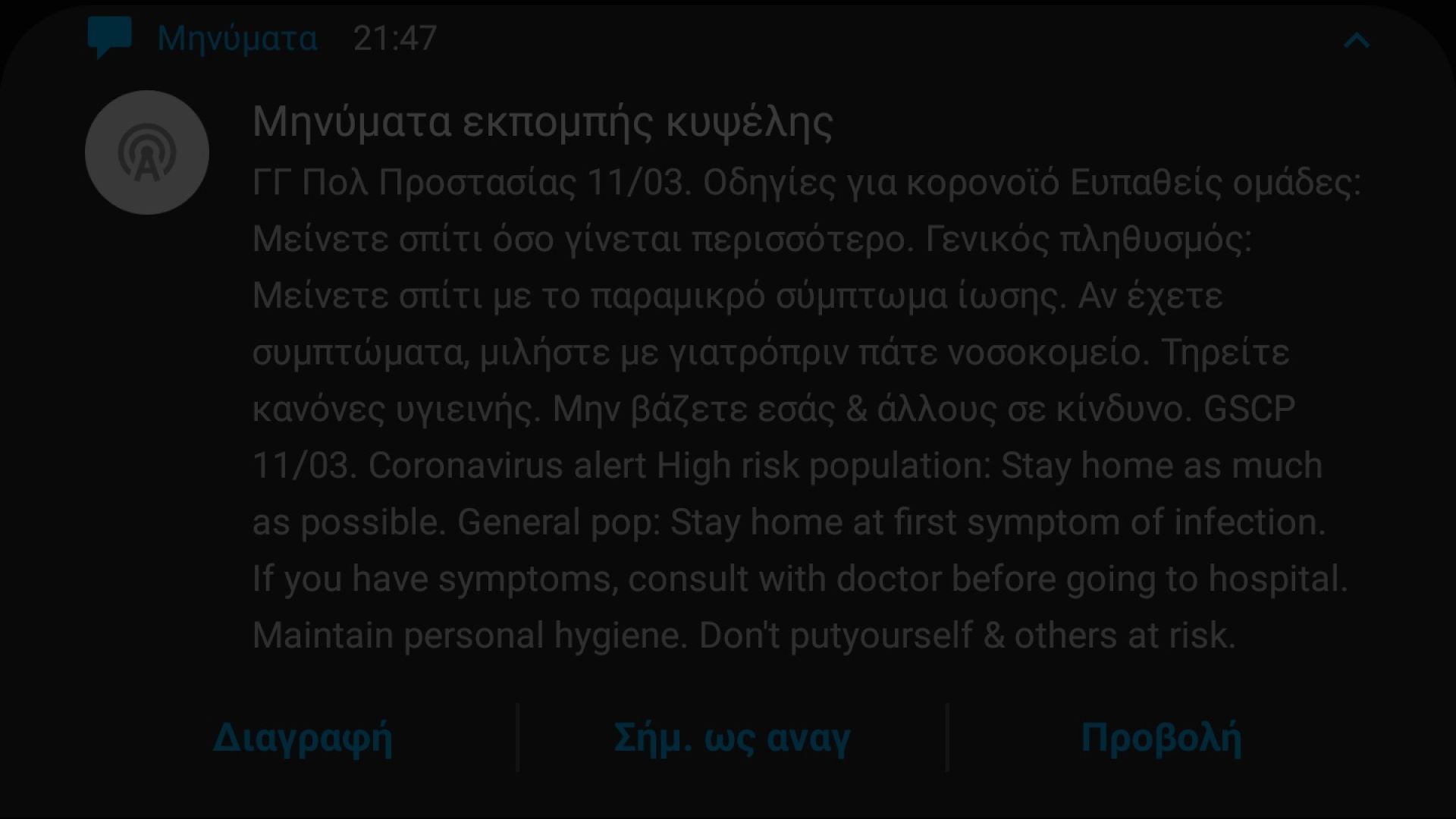 Οδηγίες της Πολιτικής Προστασίας για κορωνοϊό στάλθηκε πριν απο λίγα λεπτά σε όλη την Ελλάδα μέσω του 112 (Μυνήματα Εκπομπής κυψέλης) σε όλα τα κινητά