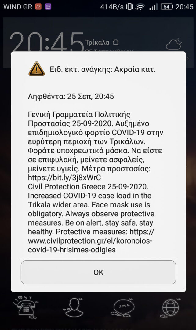 «Γενική Γραμματεία Πολιτικής Προστασίας 25-09-2020. Αυξημένο επιδημιολογικό φορτίο COVID-19 στην ευρύτερη περιοχή των Τρικάλων. Φοράτε υποχρεωτικά μάσκα. Να είστε σε επιφυλακή, μείνετε ασφαλείς, μείνετε υγιείς», αναφέρει χαρακτηριστικά το μήνυμα του «112».