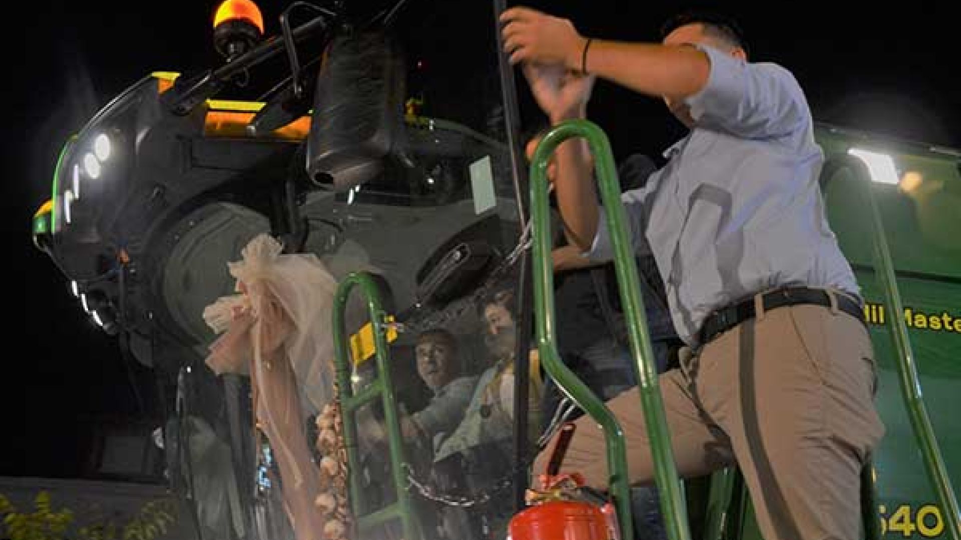 Στόλισε μια θεριζοαλωνιστική μηχανή, κοινώς κομπίνα και κρέμασε το νυφικό σε περίοπτη θέση .