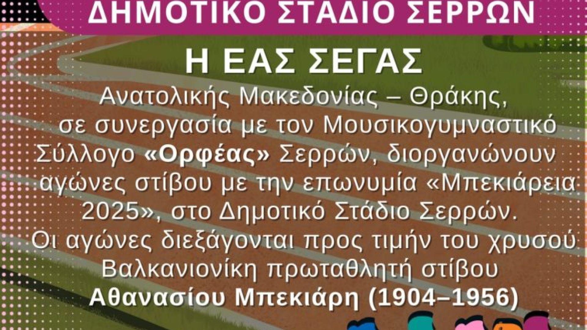 Η ΕΑΣ ΣΕΓΑΣ Ανατολικής Μακεδονίας – Θράκης, σε συνεργασία με τον Μουσικογυμναστικό Σύλλογο «Ορφέας» Σερρών, διοργανώνουν το Σάββατο 11 Οκτωβρίου 2025 και ώρα 3:00 μ.μ. τους αγώνες στίβου με την επωνυμία «Μπεκιάρεια 2025», στο Δημοτικό Στάδιο Σερρών.