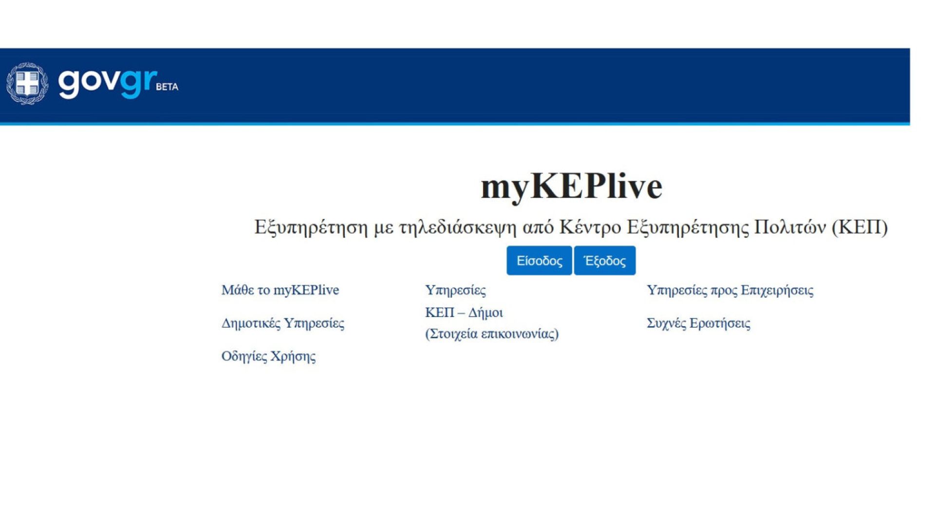 Δημιουργείται ειδική σύγχρονη πλατφόρμα τηλεδιάσκεψης (videoconference) με την ονομασία «myKEPlive.gov.gr», η οποία, μέσω της Ενιαίας Ψηφιακής Πύλης της Δημόσιας Διοίκησης gov.gr, παρέχει στους πολίτες και τους νομίμους εκπροσώπους των νομικών προσώπων τη δυνατότητα εξυπηρέτησή τους, για συγκεκριμένες διαδικασίες, από τους υπαλλήλους των Κέντρων Εξυπηρέτησης Πολιτών (Κ.Ε.Π.).
