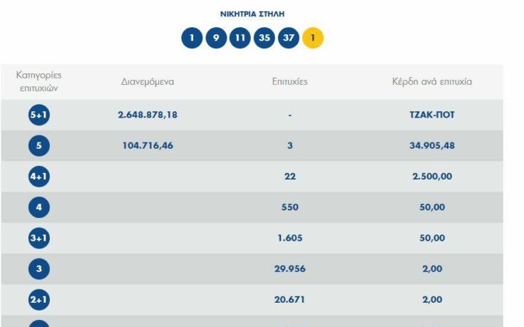 Οι αριθμοί που κληρώθηκαν είναι οι εξής: 1, 9, 11, 35, 37 και Τζόκερ ο αριθμός 1.