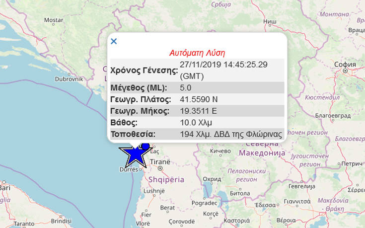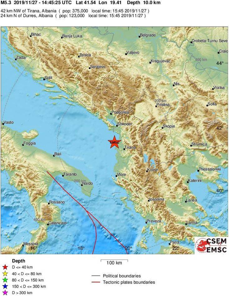 Το επίκεντρο εντοπίζεται 42 χλμ βορειοδυτικά των Τιράνων και 24 χλμ βόρεια του Δυρραχίου.