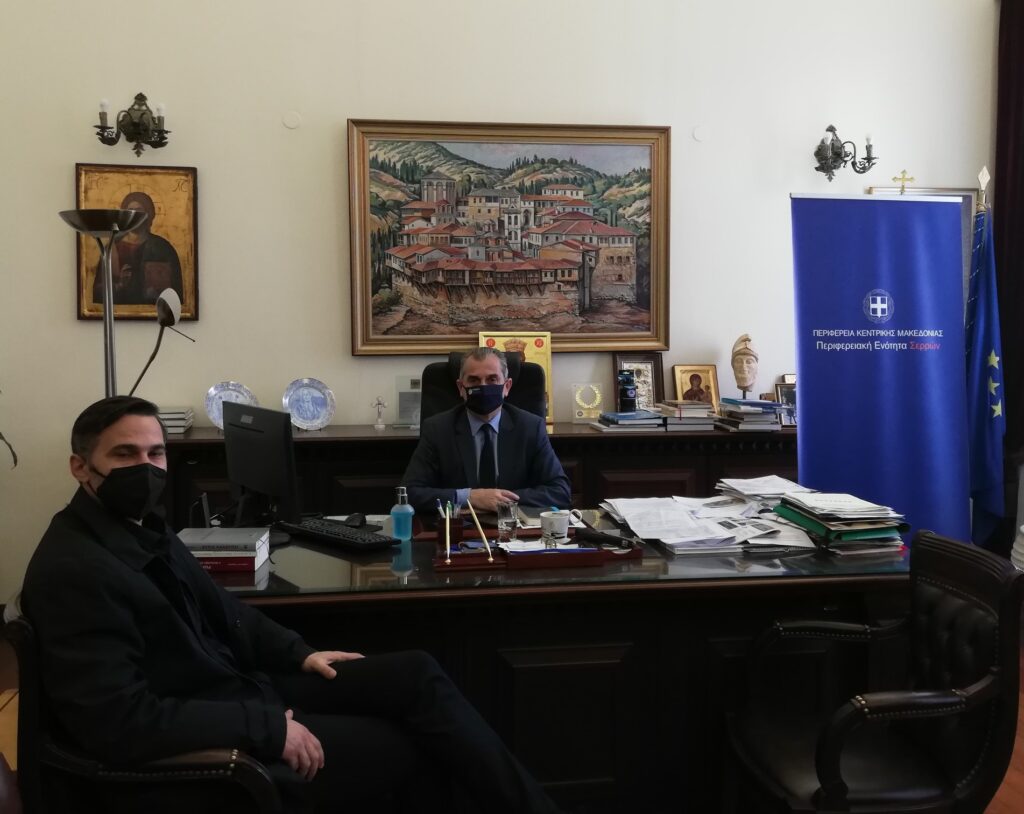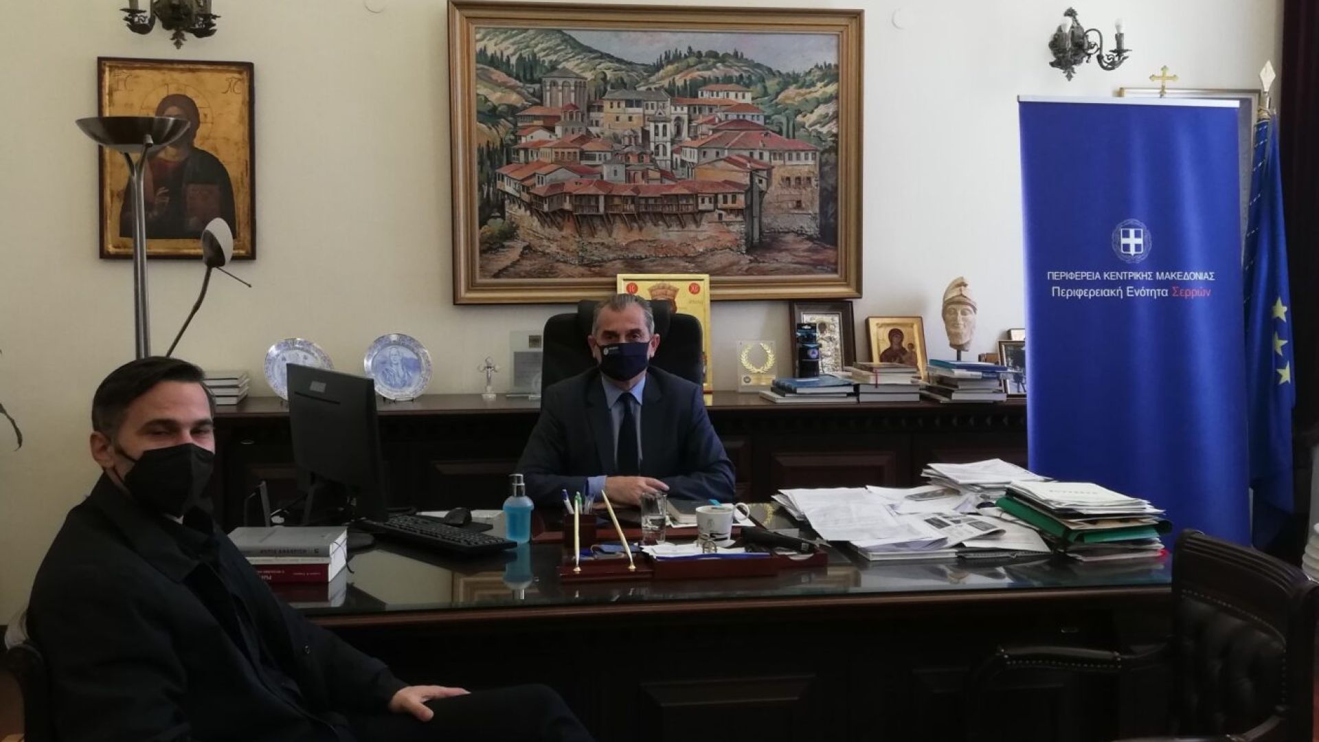 Η συνάντηση έγινε σε ιδιαίτερα θερμό κλίμα στο γραφείο του Ανιπεριφερειάρχη στο Διοικητήριο των Σερρών, με αφορμή την ανάληψη των καθηκόντων του κ. Κατσαβάκη ως Προέδρου της ΕΠΣΣ.