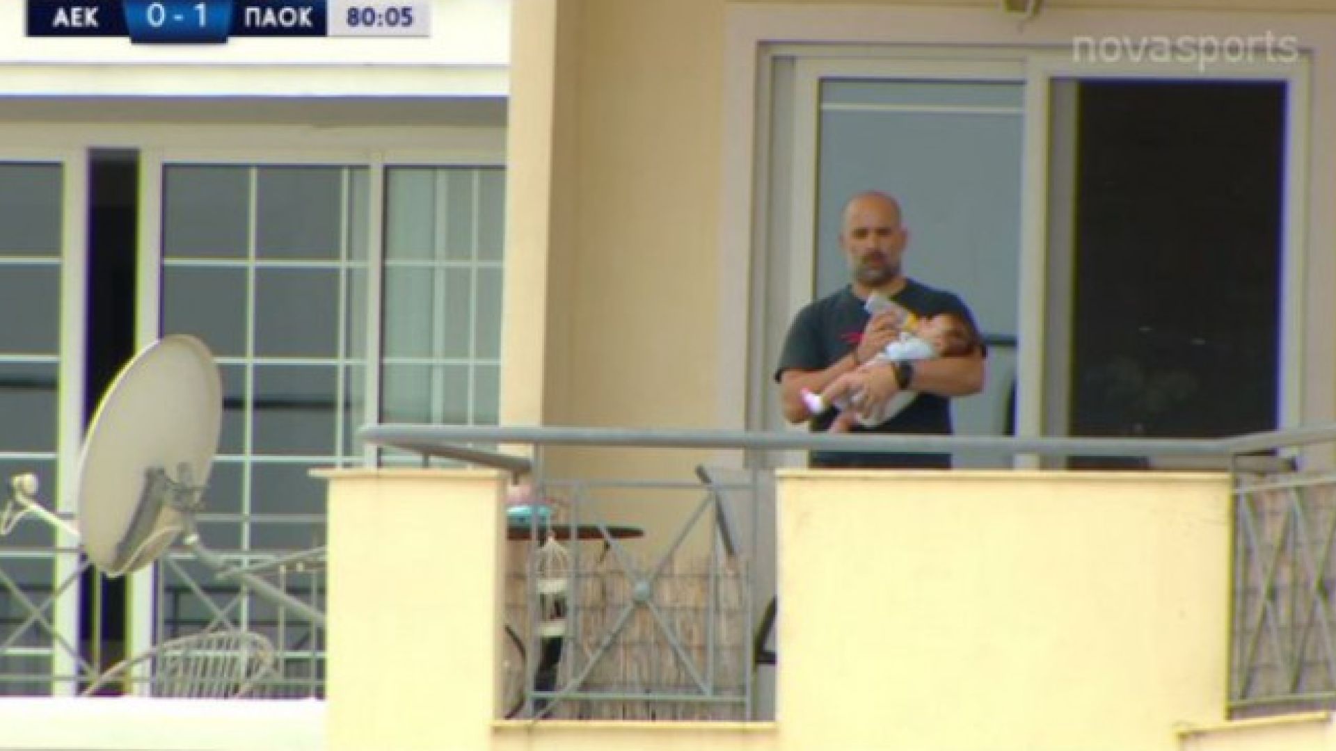 Η κάμερα των καναλιών Novasports κατέγραψε ένα απίθανο στιγμιότυπο κατά την διάρκεια του αγώνα ΑΕΚ -ΠΑΟΚ για το πρωτάθλημα των Κ19 σήμερα το πρωί: Έναν πατέρα στο μπαλκόνι του σπιτιού του να ταϊζει με μπιμπερό το μωρό του.