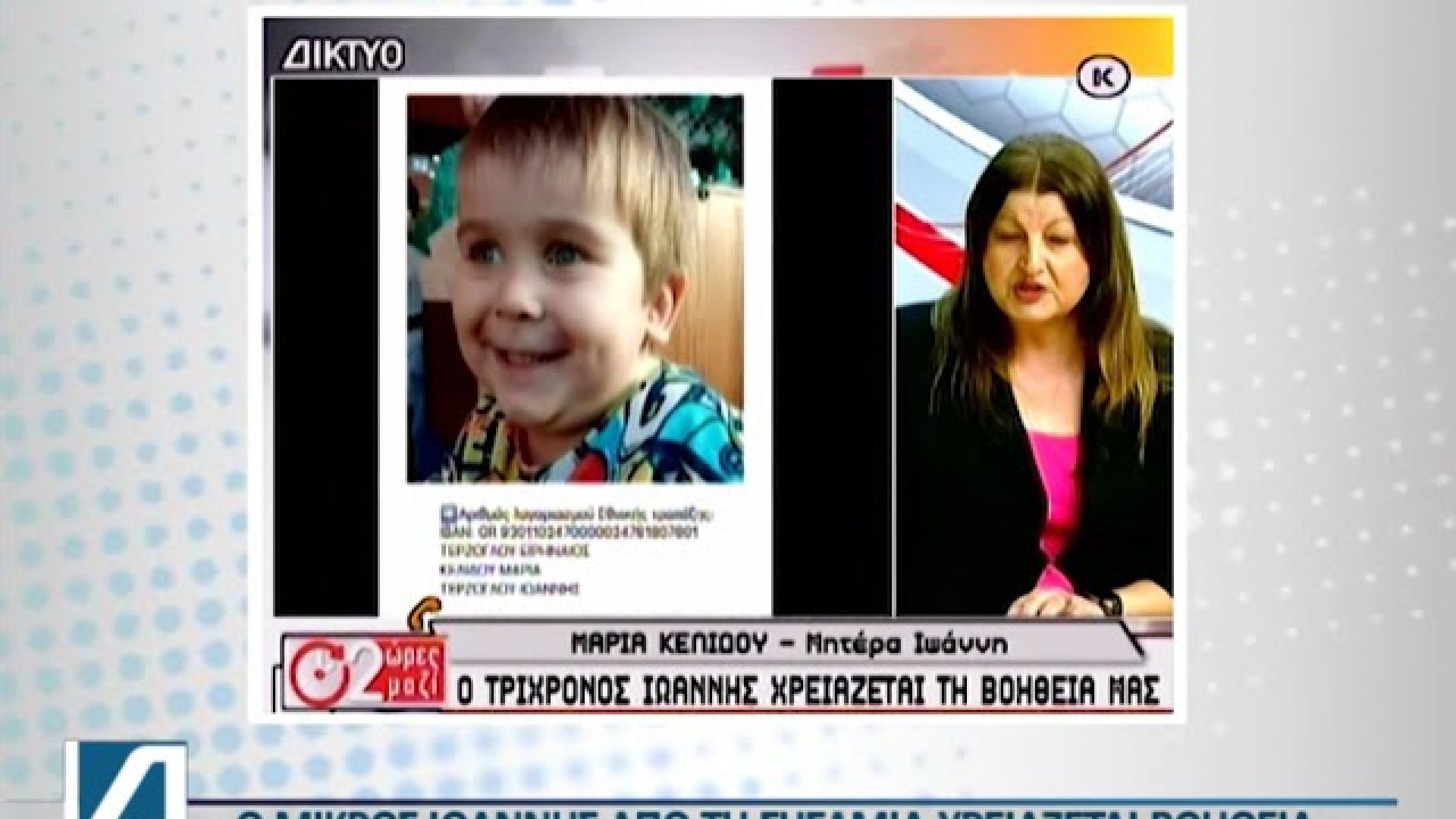 Τη βοήθεια καθενός από εμάς χρειάζεται ο μικρός, τρίχρονος Ιωάννης από τη Σησαμιά, που πρέπει να μεταβεί στις Ηνωμένες Πολιτείες για να αντιμετωπιστεί το σοβαρό πρόβλημα, που αντιμετωπίζει με την υγεία του. Ο Ιωάννης γεννήθηκε με ένα σπάνιο σύνδρομο, που επηρεάζει το ουροποιητικό, τους μύες και τους νεφρούς. Ήδη έχει υποβληθεί σε 12 επεμβάσεις, σε Ελλάδα και Ηνωμένο Βασίλειο και για να βελτιωθεί η κατάσταση της υγείας του πρέπει να μεταβεί σε εξειδικευμένο κέντρο των ΗΠΑ, όπου τα έξοδα είναι δυσβάσταχτα για την οικογένειά του.