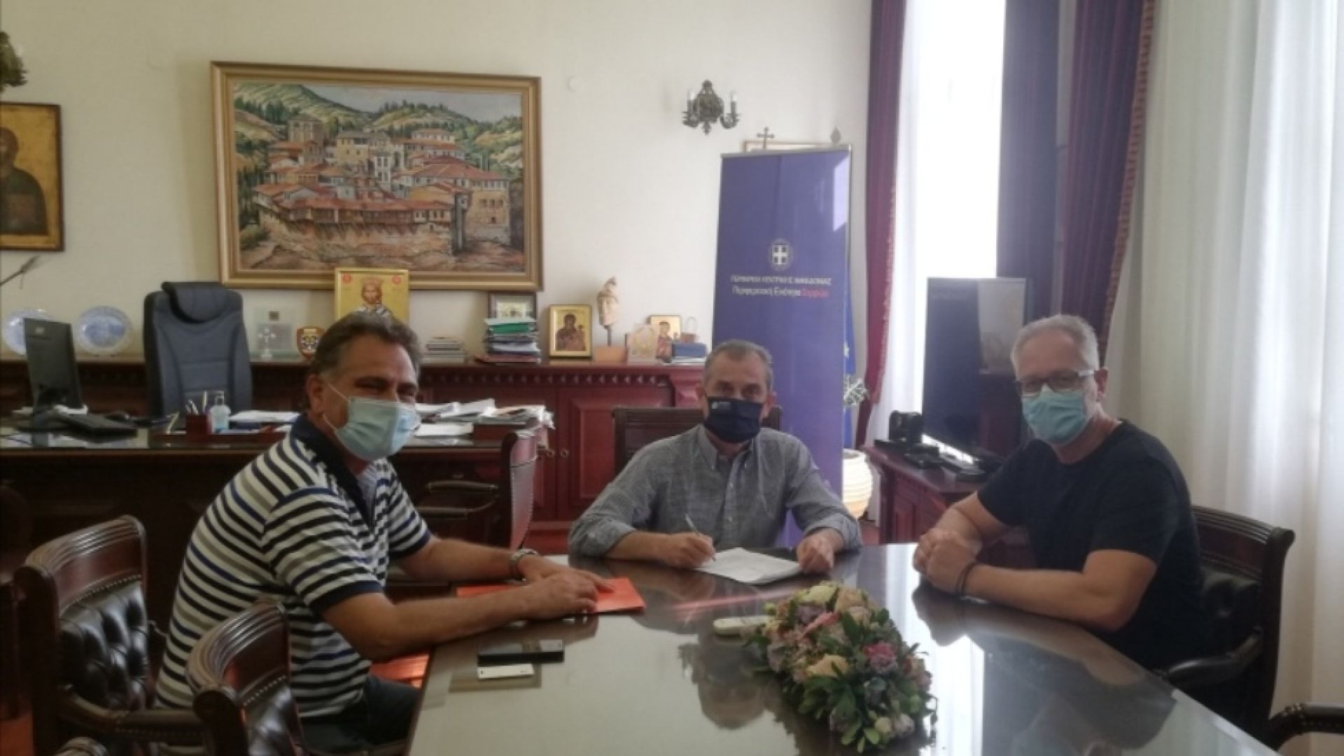 Τη σύμβαση υπέγραψε ο Aντιπεριφερειάρχης Σερρών Παναγιώτης Σπυρόπουλος και ο εκπρόσωπος της αναδόχου εργολαβικής εταιρείας.