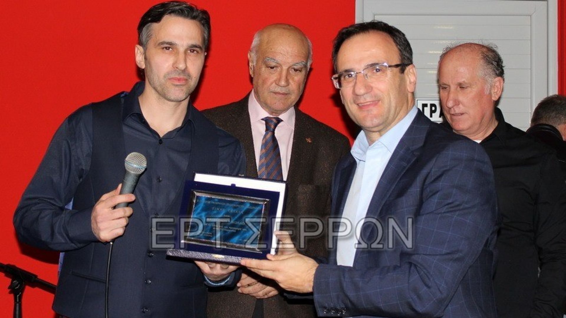 Ο Νίκος Κατσαβάκης παραλαμβάνει την τιμητική πλακέτα από τον από τον Δήμαρχο Σερρών Αλέξανδρο Χρυσάφη