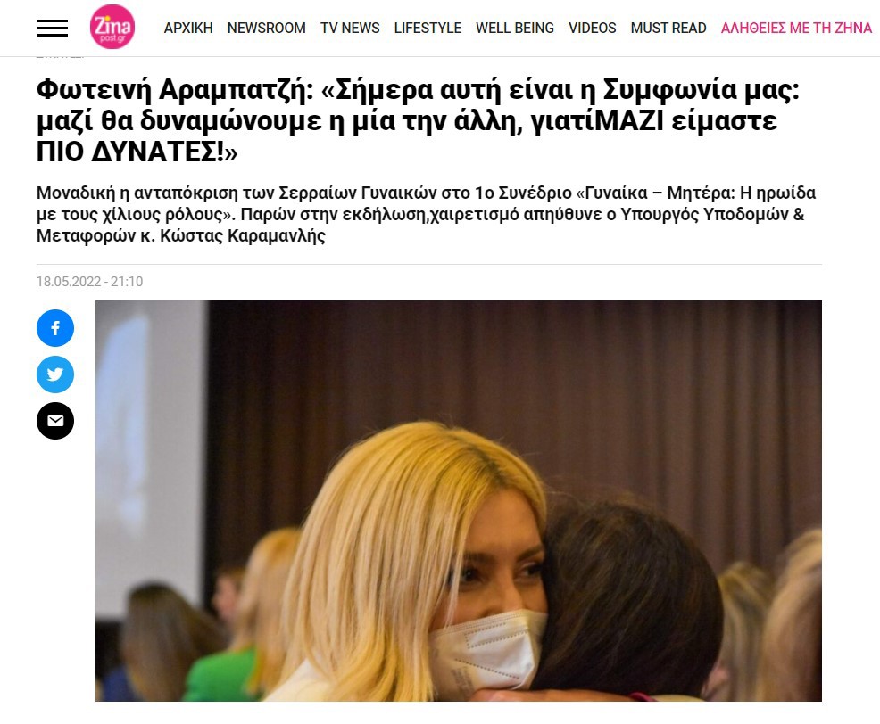 Αίσθηση προκάλεσε η ανταπόκριση των Σερραίων γυναικών στο 1ο Συνέδριο του Προγράμματος ΜΑΖΙ ΠΙΟ ΔΥΝΑΤΕΣ με θέμα: «Γυναίκα-Μητέρα: η ηρωίδα με τους χίλιους ρόλους», που πραγματοποιήθηκε την Δευτέρα, 16 Μαΐου με πρωτοβουλία της Κοινοβουλευτικής Εκπροσώπου της ΝΔ και Βουλευτή Σερρών κ. Φωτεινής Αραμπατζή.