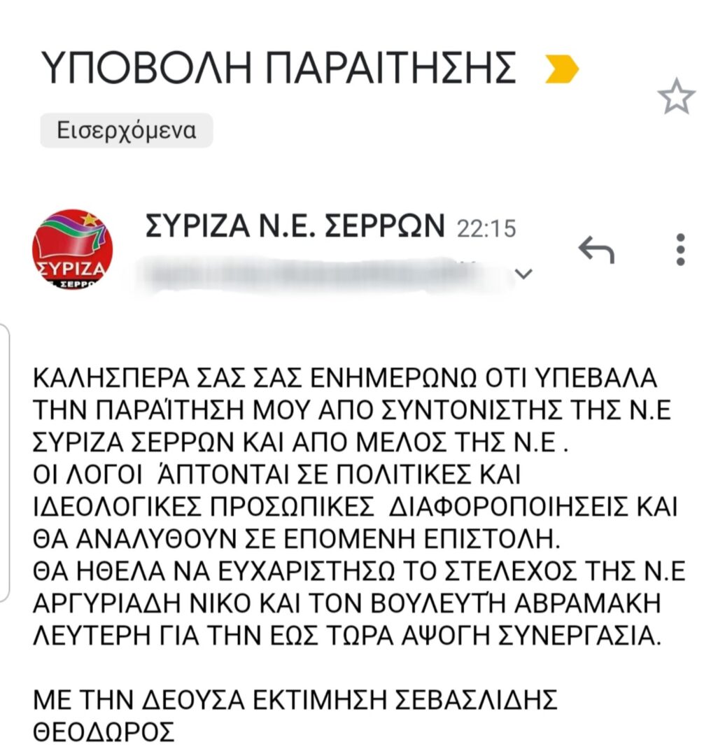 Στην παραίτησή του, η οποία κοινοποιήθηκε από την ίδια τη Νομαρχιακή στα μέσα ενημέρωσης, αναφέρει τα εξής: “Σας ενημερώνω ότι υπέβαλα την παραίτησή μου από συντονιστής της Ν.Ε.ΣΥΡΙΖΑ Σερρών και από μέλος της Ν.Ε.. Οι λόγοι άπτονται σε πολιτικές και ιδεολογικές προσωπικές διαφοροποιήσεις και θα αναλυθούν σε επόμενη επιστολή. Θα ήθελα να ευχαριστήσω το στέλεχος της Ν.Ε. Νίκο Αργυριάδη και τον βουλευτή Αβραμάκη Λευτέρη για την έως τώρα άψογη συνεργασία.