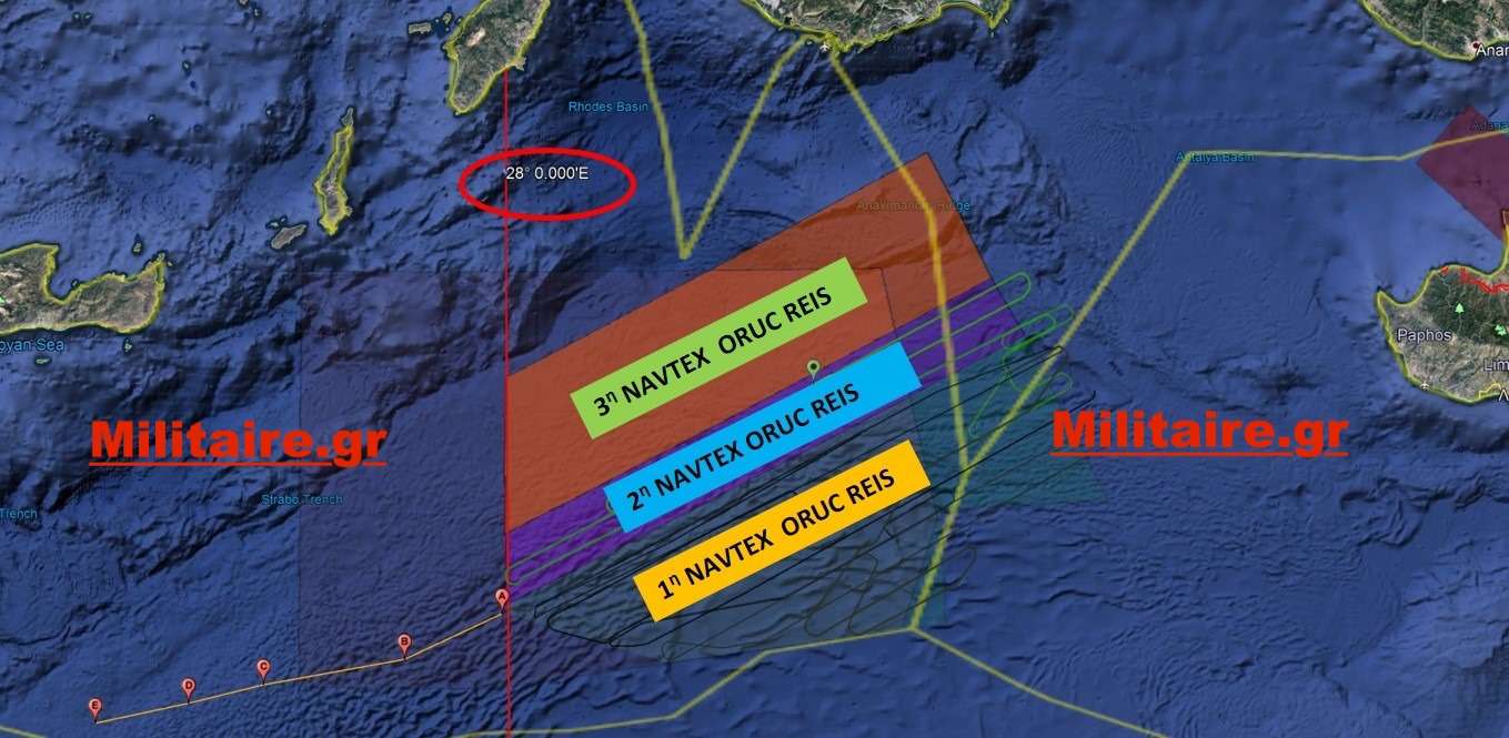 Χαρακτηριστικός της τακτικής της Τουρκίας είναι ο χάρτης με τις τρεις τελευταίες Navtex της Τουρκίας που δημοσιεύει το militaire.gr