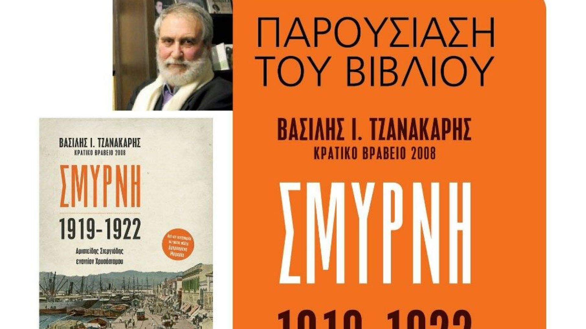 Το βιβλίο, που αποτελεί το συναρπαστικό χρονικό μιας φλογισμένης τριετίας καταγράφοντας με κάθε λεπτομέρεια τη σκοτεινή και άγνωστη σύγκρουση των δύο κορυφαίων ηγετών της Σμύρνης, του Ύπατου Αρμοστή Αριστείδη Στεργιάδη και την κορυφή της ορθοδοξίας, τον μητροπολίτη Χρυσόστομο, θα παρουσιαστεί από τον Υπουργό Μακεδονίας – Θράκης Θ. Καράογλου και τη φιλόλογο Σύλια Ζέττα ενώ ο συγγραφέας θα απαντήσει σε ερωτήσεις του κοινού και θα υπογράψει αντίτυπα του βιβλίου του.