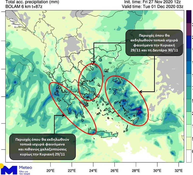 «Μεταβολή θα παρουσιάσει ο καιρός από τις πρωινές ώρες της Κυριακής (29-11-2020) από τα δυτικά, με βροχές και κυρίως στα θαλάσσια-παραθαλάσσια καταιγίδες, που θα συνοδεύονται κατά τόπους από πολύ ισχυρούς ανέμους.