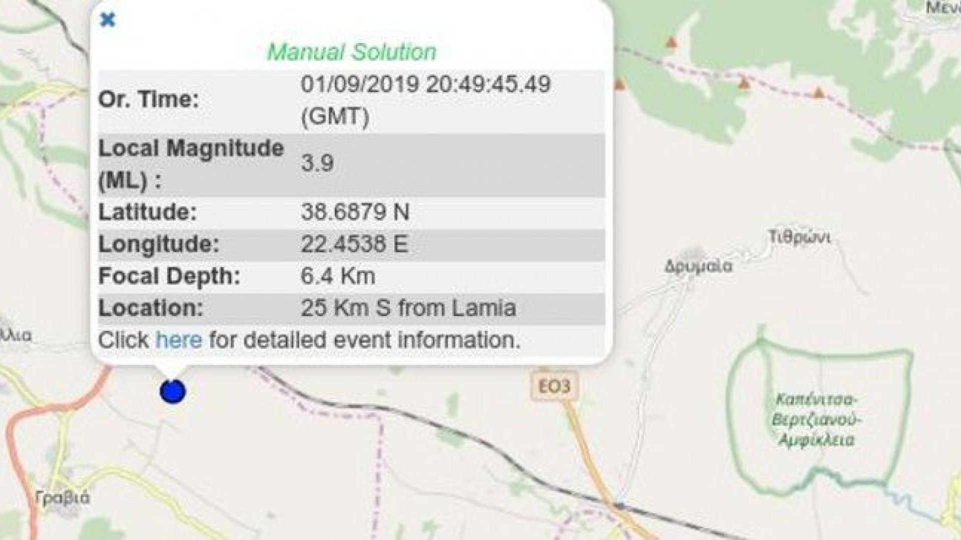 Συγκεκριμένα, στις 23:49 έγινε ο σεισμός και ήταν μεγέθους 3,9 βαθμών της κλίμακας Ρίχτερ. Σύμφωνα με το Γεωδυναμικό Ινστιτούτο Αθηνών, το επίκεντρό του ήταν 14 χιλιόμετρα δυτικά της Αμφίκλειας και στα 25 χιλιόμετρα νότια της Λαμίας, ενώ το εστιακό του βάθος ήταν μικρό.