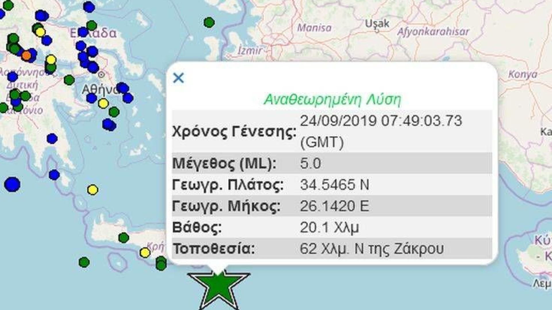 Σεισμός 5 Ρίχτερ σημειώθηκε πριν από λίγη ώρα ανοιχτά της Κρήτης, σύμφωνα με το Γεωδυναμικό Ινστιτούτο.