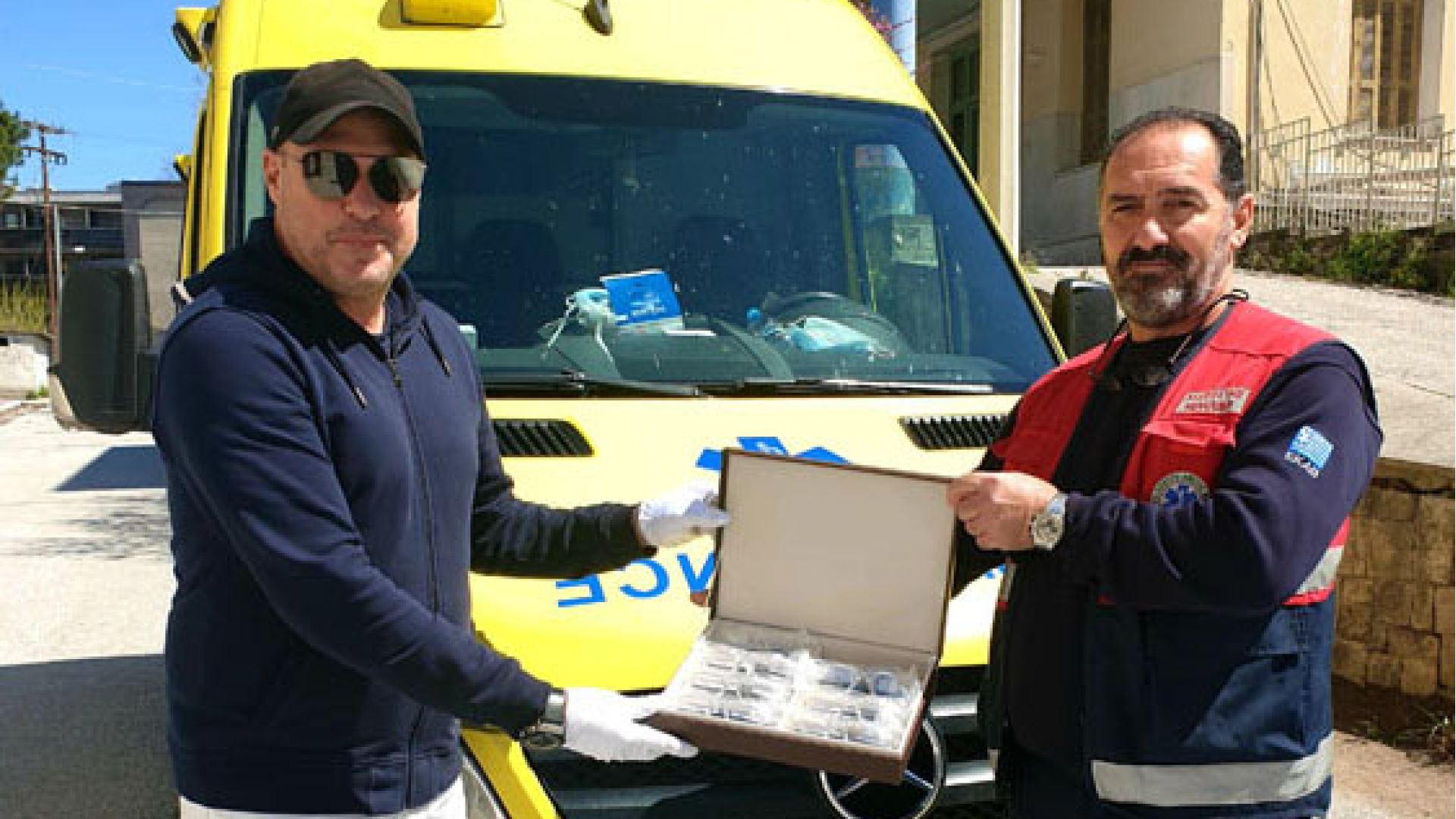 Στη φωτογραφία ο κ. Στέφανος Παπανίκος με τον κ. Χρήστο Σκύρλα, υπεύθυνο του ΕΚΑΒ τομέα Σερρών την ώρα που παραδίδει τα προστατευτικά γυαλιά.