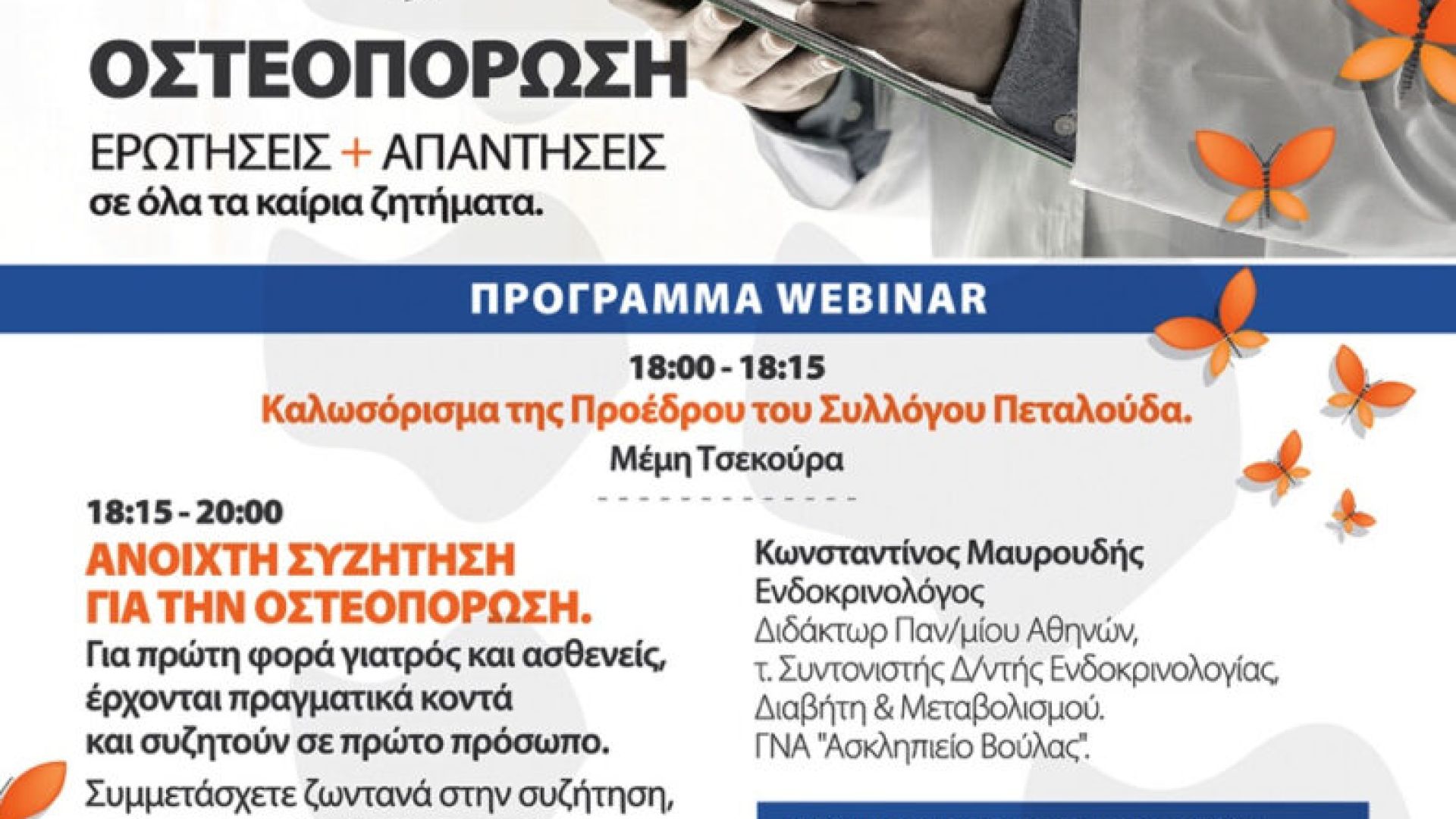 Το Τμήμα Δημόσιας Υγείας του Δήμου και ο Σύλλογος Σκελετικής Υγείας Πεταλούδα Σερρών προσκαλούν στο Δωρεάν Διαδικτυακό Σεμινάριο για την οστεπόρωση, όπου οι ασθενείς έχουν την ευκαιρία να έρθουν ακόμη πιο κοντά στον γιατρό και να ρωτήσουν ελεύθερα ότι τους απασχολεί.
