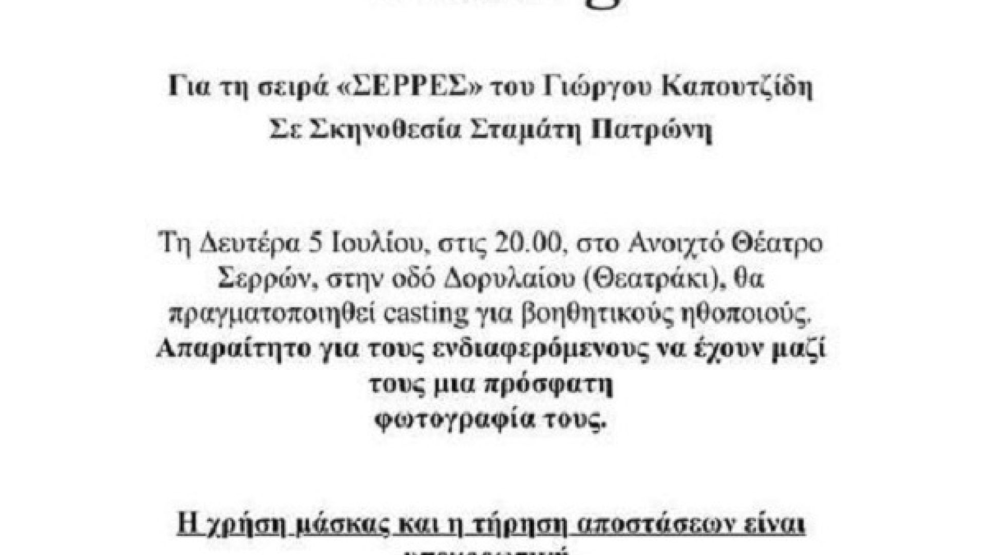 Το κάστινγκ θα διεξαχθεί τη Δευτέρα 5 Ιουλίου στις 20:00 στο ανοιχτό θέατρο Σερρών, στην οδό Δορυλαίου (Θεατράκι).