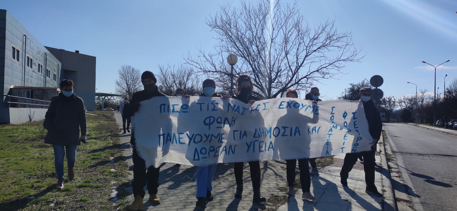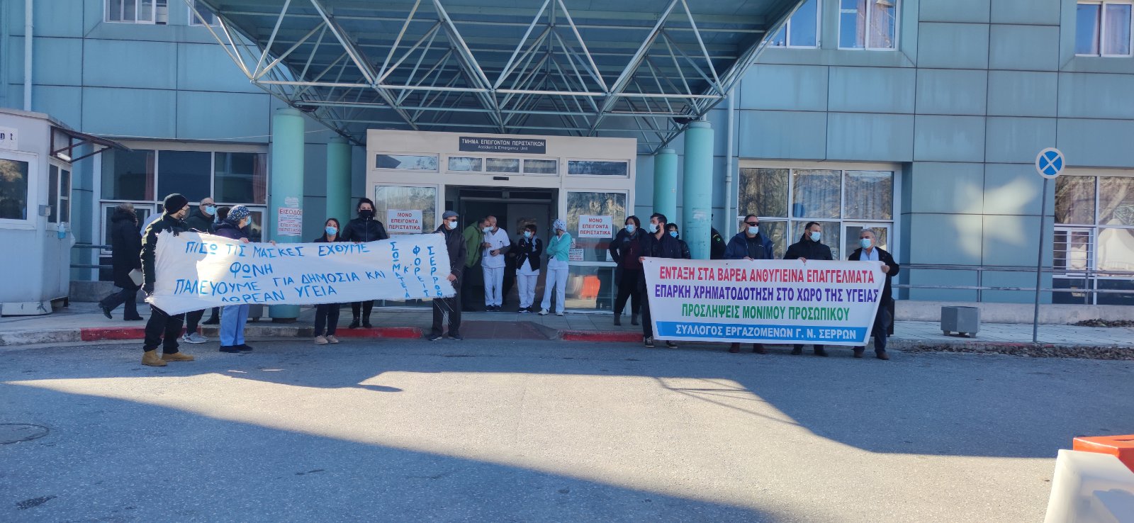 Παράσταση διαμαρτυρίας πραγματοποίησαν οι λειτουργοί υγείας στις Σέρρες ,οι οποίοι και συγκεντρώθηκαν στην είσοδο των τακτικών ιατρείων του Νοσοκομείου Σερρών.