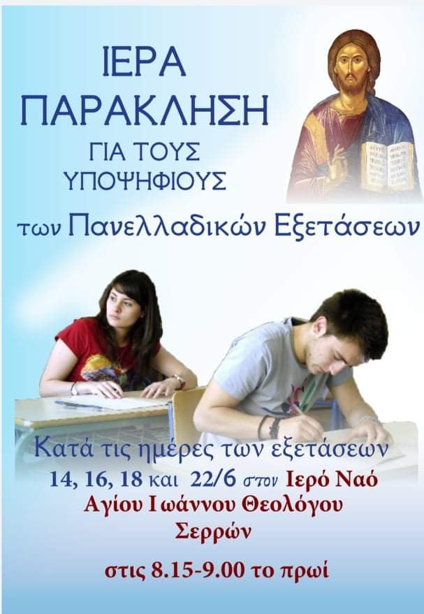 Από αυτή την προσπάθεια των παιδιών δεν θα μπορούσε να λείψει η εκκλησία, η οποία πάντα βρίσκεται στο πλευρό τους. Ήδη, ο Ιερός Ναός Αγίου Ιωάννου Θεολόγου στις Σέρρες ανακοίνωσε ότι κατά τη διάρκεια των Πανελληνίων Εξετάσεων και συγκεκριμένα στις 14, 16, 18 και 22 Ιουνίου θα τελούνται στον Ιερό Ναό, από τις 8:15 μέχρι τις 9:00 το πρωί, Ιερές Παρακλήσεις για τους υποψηφίους των πανελλαδικών εξετάσεων. Εμείς να ευχηθούμε σε όλα τα παιδιά καλή επιτυχία!