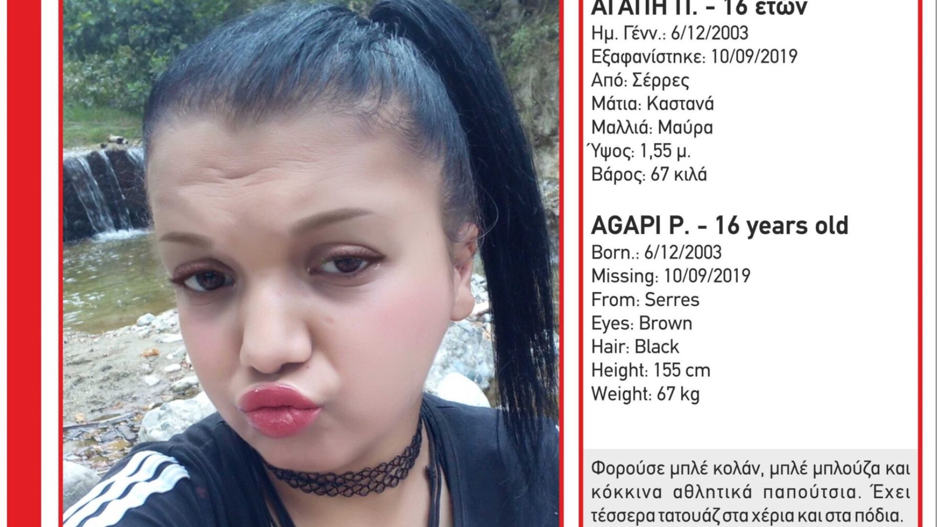 Εντοπίστηκε πριν από λίγες ώρες η 16χρονη Αγάπη Π. που είχε εξαφανιστεί από την πόλη των Σερρών την περασμένη Τρίτη 10 Σεπτεμβρίου και είναι καλά στην υγεία της.