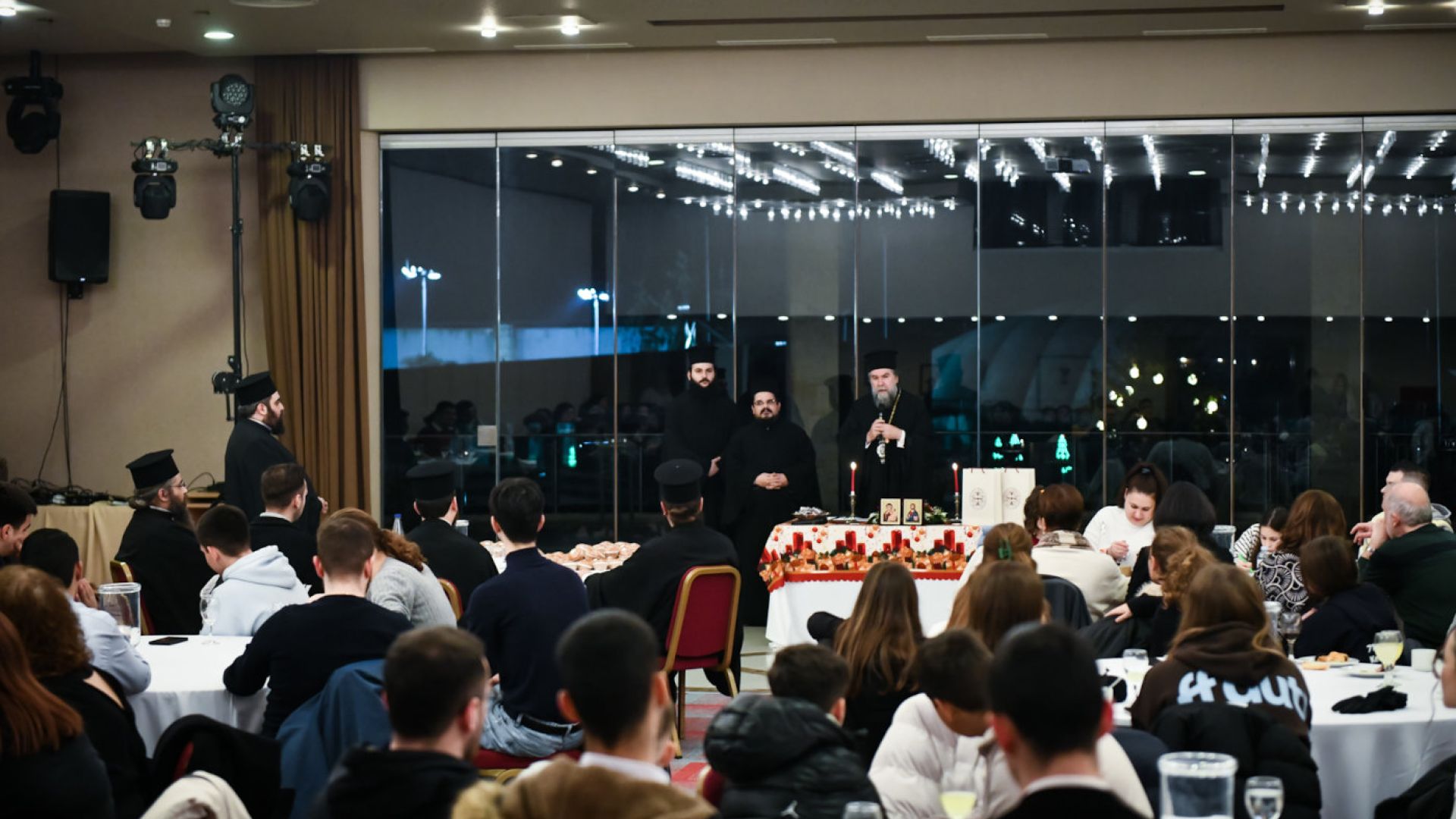 Στην συνέχεια, στις 8:00 το βράδυ, ο Σεβασμιώτατος παρευρέθηκε στην σύναξη φοιτητριών και φοιτητών – νέων, που πραγματοποιήθηκε με την φροντίδα του Γραφείου Νεότητος στο ξενοδοχείο «ELPIDA RESORT» των Σερρών. Η προσέλευση των νέων για μία ακόμη χρονιά υπήρξε εντυπωσιακή και συγκινητική.